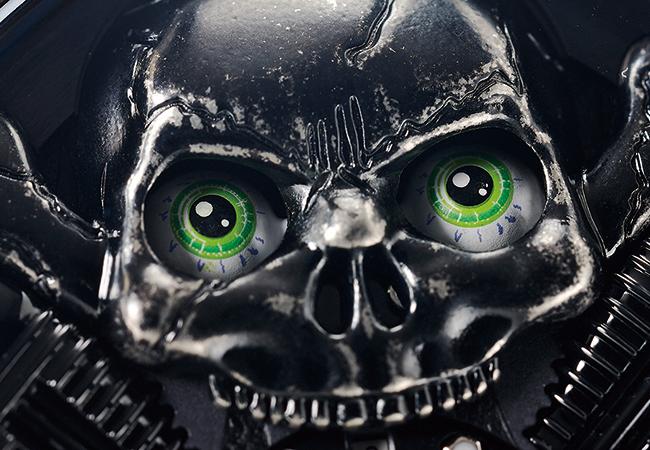 炸彈錶BOMBERG的風格向來強烈,而今年推出的這款Bolt-68 Skull Rider骷髏騎士腕錶更是強烈到讓人難以忽視。面盤上方的骷髏頭與引擎的浮雕圖騰,表現龐克騎士風格。特別的是骷髏雙眼加入配重塊,因此眼球會保持單一方向。腕錶相對位置改變,時而翻眼,時而緊迫盯人,相當有趣。時分盤位於六點鐘位置,雖然面盤圖騰複雜,但用色對比反差,判讀時間也不致困擾。