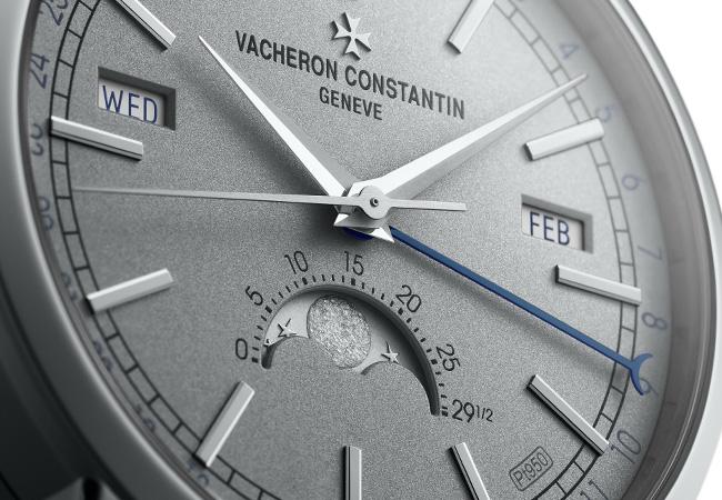 鉑金材質指針和時標,藍色阿拉伯數字日期指示,與簡潔純粹的錶盤相得益彰,而鉑金月相盤也是這枚腕錶的別緻之處。星期和月份視窗位於錶盤邊緣且互相對稱,日期則由纖細的藍色中央指針指示,這一非常規的設計兼具平衡之美和易讀性。