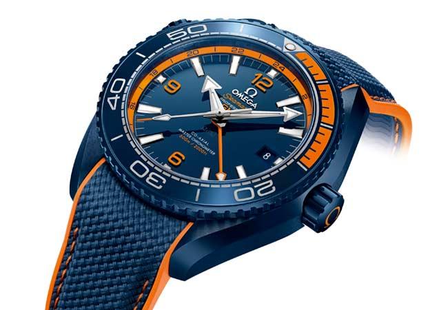 以歐米茄海馬系列Planet Ocean「Big Blue」大師天文台GMT腕錶為例,錶殼、錶冠、面盤都是用藍色陶瓷製作,而錶圈的部分是以藍色陶瓷為基礎,結合液態金屬和橡膠而成。銀灰色的刻度是液態金屬材質,而橘色部分則是橡膠,雖然是由三種材質組成,接縫處摸起來卻非常滑順,猶如一體。