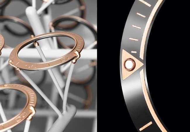 當陶瓷錶圈燒結成型後,先以鐳射雕出刻度的凹槽,再將環形的液態金屬薄片置於其上,並加熱到液態金屬黏稠的溫度,讓它填滿凹槽。待冷卻後,磨掉溢出的金屬,並將整個錶圈拋光,就能看到液態金屬刻度的陶瓷錶圈。陶瓷與橡膠結合的部分,也是用同樣的手法製作,只是把液態金屬改成適合這種工藝的合成橡膠而已。