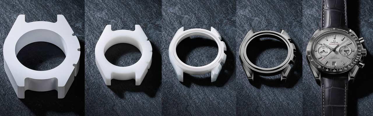 陶瓷雖是一項古老的工藝,但歐米茄的陶瓷工藝可非傳統能比。本文最上方的橫幅表現了金屬灰色等離子陶瓷錶殼的製作流程,由左至右分別為:成型、燒結、打磨、等離子處理、組裝成錶。其中可以看出在燒結之後,體積會縮小約25%,之後再用鑽石粉末打磨堅硬的陶瓷粗胚。這縮小的比例很難精準控制,如果稍有誤差,錶殼與其他零件組裝時便可能空隙過大或根本無法組裝。還好這對歐米茄來說並非難事!