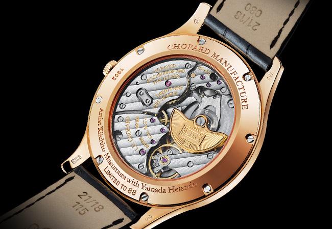 以22K金打造的擺陀施以倒角打磨、鐫刻與機刻圖紋,橋板則潤飾日內瓦波紋,整個機芯由蕭邦弗勒里耶錶廠的專家巧手依循傳統製錶的最高美學和技術標準進行潤飾。欣賞這款腕錶之際,似乎可看到栩栩如生、從瑞士到亞洲的各項傳統與技藝浮現眼前,建構出以追求卓越精神為主體的跨域交流。