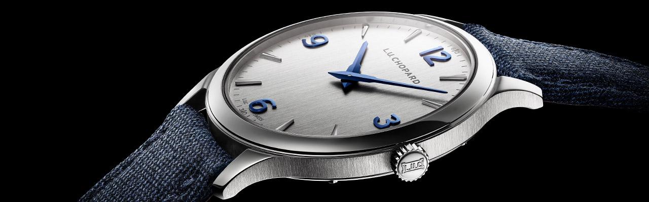 堅硬的精鋼再配上以藍色羊絨編織而成的柔軟錶帶,錶帶內襯手工縫製棕色鱷魚皮,這款羊絨錶帶首次出現在L.U.C.系列,以提供更豐富多樣的選擇;L.U.C XP腕錶也可搭配藍色鱷魚皮錶帶。