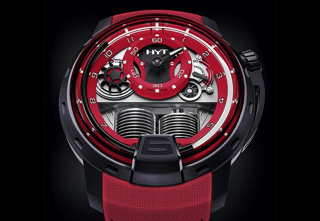 如果說到以液體顯示時間的腕錶,粉絲們會想到哪款腕錶呢?答案應該呼之欲出了吧!沒錯~就是HYT,而這裡小編要介紹HYT的HYT H1 Colorblock腕錶。這款腕錶共推出紅、黃與藍三色,顏色都相當鮮豔。H1的液體顯示主要分為三個結構,分別為玻璃管、染色液體以及加壓幫浦。簡單來說就是機芯推動6點鐘位置的兩顆蛇腹幫浦,然後液體由6點鐘位置開始順時針位置移動,繞到另一頭的幫浦後再逆流回去,呈現有趣的畫面。