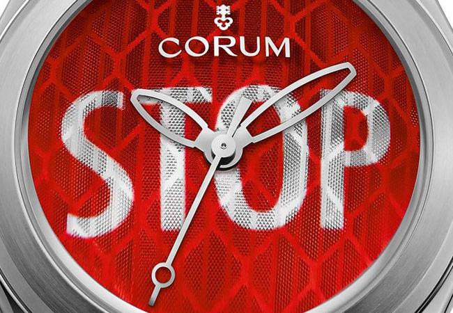 小編就按照字幕順序來分享,首先來看到崑崙表CORUM的Big Bubble泡泡系列52 mm Stop腕錶,超大錶徑配上宛如泡泡般凸出的鏡面,光是外型就讓人印象深刻。至於豔紅面盤,配上大大的「STOP」字樣,其實是以反恐攻擊作為題材,英文字母開宗名義就是希望能停止恐怖攻擊。面盤材質還使用公認世界最佳瑞士路標反光材質設計,加上蜂窩狀網格,增添層次感。