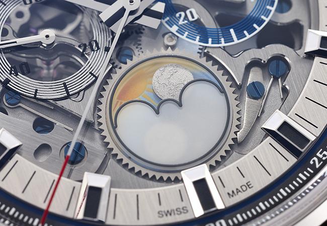 由於面盤採用局部透明設計,因此我們可以在調整日期時,看見整個日期盤的快速轉動,還有快調月相功能時(隱藏按鍵位於錶殼八點鐘位置),齒輪與周遭零件的細微互動,以及擺輪與擒縱結構的運作,這些都是以往非透明面盤所無法達成的目標。