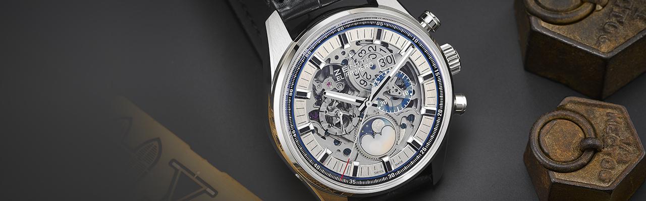直徑40mm不鏽鋼錶殼/時間指示、大日期、日夜顯示、月相盈虧與計時功能/El Primero 4047B自動上鍊機芯,動力儲存50小時/藍寶石水晶鏡面、透明底蓋/防水100米/參考價NTD 380,200