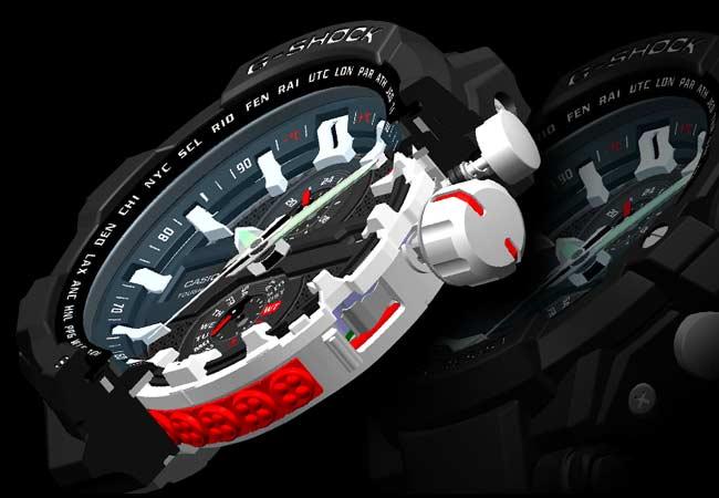 在手錶圈裡講防震最出名的,你大概猜到了。那不就是CASIO卡西歐的G-Shock嘛!用液晶顯示的G-Shock自然相對容易防震,所以我們就來看看指針顯示的錶款。從上圖可以看到在白色機芯固定座(和時標整合在一起)的邊緣用上了標示紅色的彈性材料αGEL,能更進一步吸收外來衝擊力,確保機芯內部的穩定性。事實上,卡西歐官網上還表示,連指針配重都經過精密計算,即使產生強大離心力,也能平穩運行。