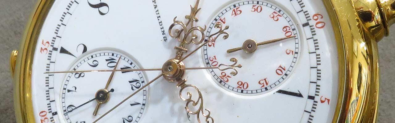 Spaulding是百達翡麗在芝加哥的經銷商,這只懷錶是百達翡麗為Spaulding製作的款式,早期的計時碼錶很多只有計時秒針,這只錶卻配置了60分鐘的計時針盤和12小時計時針盤(小秒針同軸),再加上追針計時、三問功能,非常了得。