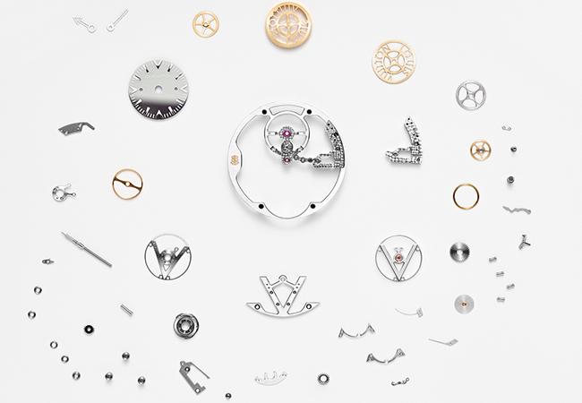 名為Gravity Tourbillon,漂浮感想必是視覺重點,照這個邏輯推下去,飛行陀飛輪的設定也就合理合理,畢竟飛行陀飛輪最具美感的狀態,就是在於它擺脫錶橋所具備的飄浮感。LV在這裡以藍寶石水晶玻璃製作錶鏡、底蓋和夾板,機芯呈現一直線的排列,包夾在藍寶石水晶中間有一片主金屬基板,從零件圖可以看見上下各有兩個孔洞,上方的孔洞用來固定時分盤,而下方兩個鑽孔則是用來鎖定可從錶背看見的飛行陀飛輪下層V型夾板。由於飛行陀飛輪沒有上支架的錶橋結構,因此陀飛輪框架必須完全固定在基板的底座,底座的堅固與否,關係到整個陀飛輪的運行、耐用度與精準度,所以飛行陀飛輪會有一個較為厚實的底座結構,然後再將整個陀飛輪框架置於上方。
