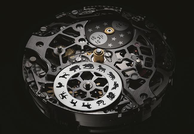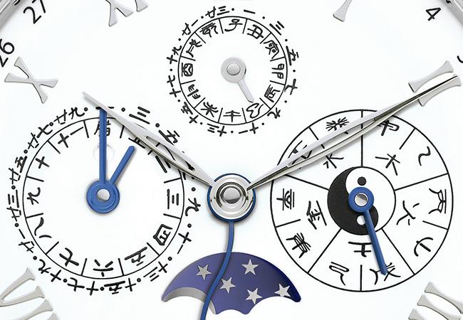 12點鐘位置的小錶盤顯示時辰數位及字元(24小時一週期);3點鐘位置顯示五行元素和十天干(10年一週期);9點鐘位置顯示農曆月(12個月一週期)、農曆日(30天一週期)及閏月;12點鐘位置的年份視窗顯示當年所屬生肖(12年一週期),月相盈虧顯則位於錶盤6點鐘方位。2018為中國狗年,一隻生肖狗昂首立於12點鐘位置,寓意2018吉犬「旺」年,福祿呈祥。