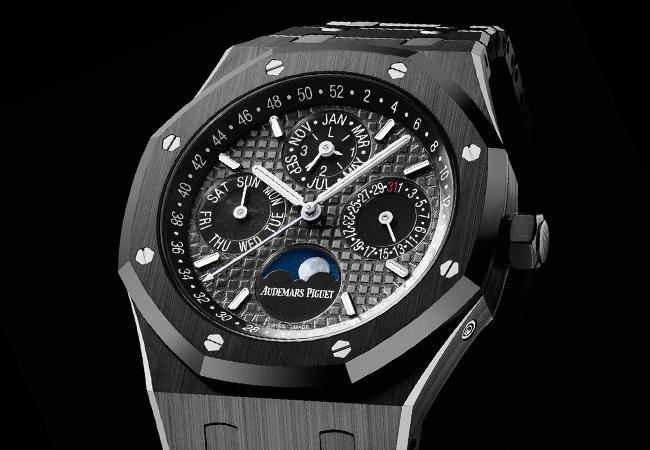愛彼AUDEMARS PIGUET在1955年推出了世界首款具備閏年顯示功能的萬年曆腕錶,而在2016年則發表了皇家橡樹萬年曆腕錶,結合Gerald Genta的高識別度八角錶殼與貴金屬材質,而隔年2017則在SIHH上亮相了全黑陶瓷版本。內部搭載大尺寸5134自動上鍊機芯,擁有萬年曆功能,功能平均分布於面盤小錶盤上,外環還有一年週數顯示,算是萬年曆中少見的功能。除了錶身外,鍊帶也以黑色陶瓷打造,所需時間是一般皇家橡樹鍊帶5倍,更加耗時費工。大型格紋面盤「Grande Tapisserie」以黑色PVD呈現,讓尊貴的皇家橡樹多了時下流行的潮味,也反映了AP迷們的年齡層有年輕化趨勢!