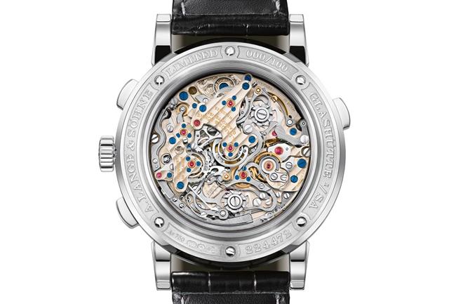 朗格也首度把方便的飛返功能加入,而且是三種數據都會同時進行此動作,這種連動性可說是製錶師組裝上嚴厲的考驗,不僅要顧及三種數據,遑論這三種數據盤上都各帶有兩根指針。另外,為了維持腕錶的適戴性,就算機芯內加入了動力儲存顯示跟飛返功能所需的零件,朗格於組裝位置也審慎考慮,稍事移動了動力儲存結構於正面,這舉動能讓背面的計時結構擁有最大的空間,也讓Triple Split最後維持43.2mm的適中錶殼直徑,