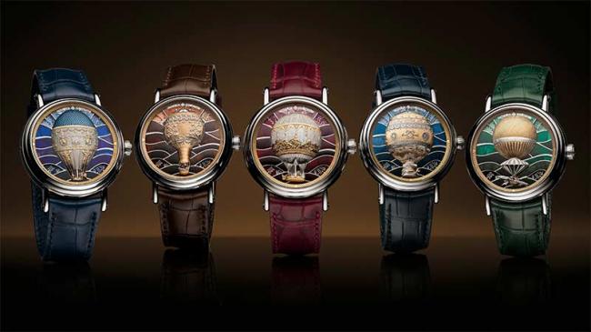 江詩丹頓Métiers d’Art藝術大師系列Les Aérostiers熱氣球腕錶將精美的手工雕刻和微雕熱氣球懸浮於半透明的鏤空琺瑯背景之上,微縮工藝如實還原了1783至1785年間在法國完成的五次熱氣球飛行壯舉。