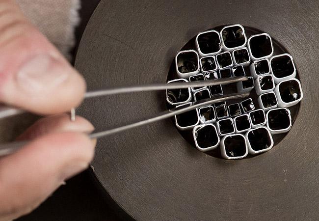工匠從中拉出長長的細水晶芯柱,然後再切割成數小段。最後,再利用這些長形芯柱組合出所要的圖案。這到底是動物鱗紋還是水晶圖紋?本錶款僅限量發行兩枚,在這眩目的千花時光中,領略似真似幻的神奇。