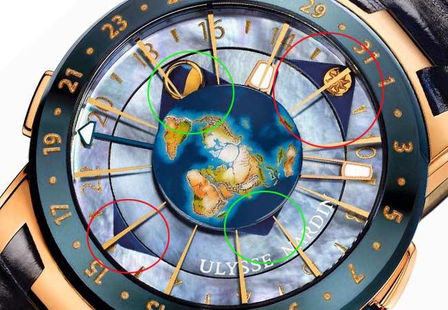 上圖中的面盤中央畫的是地球,靠近12時位置紅圈處裡面的金色圓圈代表太陽,靠近9時位置綠圈處裡的金圈視窗代表月亮,紅、綠圈起來的四個地方可以看到像是藍色三角形的標示,那是代表漲潮的大小,藍色越大、漲潮越大。面盤上的地球固定不動,但月亮、太陽與漲潮標示都會按照實際的天文狀況運行,所以只要對照漲潮標示與地球圖案,就能直觀地看出地球各地的潮汐變化了。