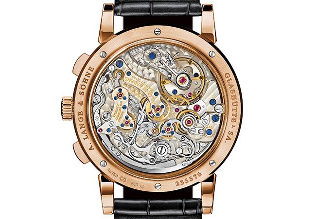 1815 “Homage to Walter Lange”掌握兩大計時功能。在6時位置的小錶盤上,小秒針每格刻度推進6步,這同時代表著每小時21,600次的振頻。藍鋼中央秒針則每秒精確跳動一次,並可依照需要連續運行或固定不動。設於2時位置的按鈕可啟動並掣停秒針。這對於心跳率測量尤其實用。
