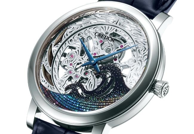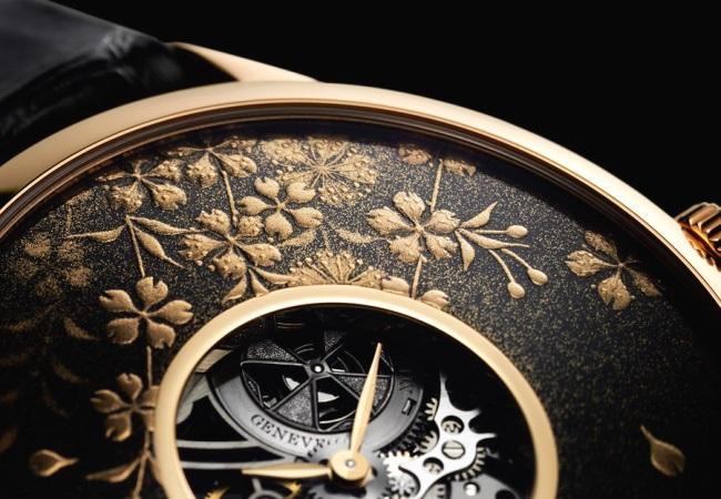 至於鎌倉時代,開始出現高蒔繪(Taka-makie)技法,這項技術是利用漆的黏性,在表面堆起一定的高度,然後將粉末撒在這些圖案之上;因此,圖案的高度明顯高於漆面,具有立體感。而這項技術,也是近年來,各大錶廠最常採用的蒔繪技法,因為面盤的尺寸較小,所以高蒔繪的效果明顯較好。