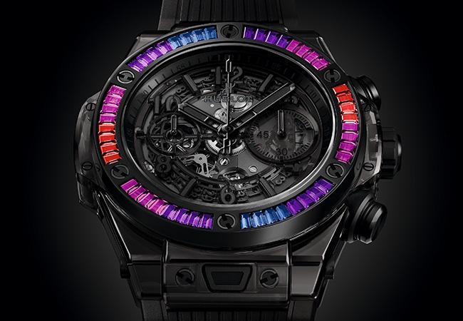 Big Bang Unico 藍寶石銀河腕錶共有兩種版本:象徵深邃宇宙為Big Bang Unico 黑色藍寶石銀河腕錶,象徵璀燦星河的Big Bang Unico藍寶石銀河腕錶。兩只腕錶分別展現藍寶石可見與不可見的雙重特質,穿透視覺的鏤空設計,從正面便可欣賞到UNICO HUB1242自製機芯的複雜結構,以及導柱輪驅動時的機械美感。