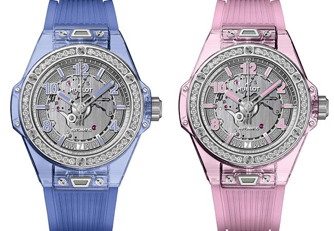 全新Big Bang One Click藍寶石腕錶擁有39毫米錶殼,分別以透明藍寶石、粉紅色藍寶石與藍色藍寶石打造而成。浪漫而獨特的粉紅色與晴空藍的誕生的秘密在於氧化鋁與氧化鈦或氧化鐵的融合。腕錶錶圈鑲嵌42顆鑽石,光彩奪目,透明錶殼搭載同色系錶帶,搭配“One-Click”單鍵快拆式錶帶裝置,可輕鬆快速更換錶帶,藍寶石可見之不可見的可塑性與硬度也詮釋女性獨有的溫柔與韌性。不僅如此,腕錶線條經過鑽石的切割勾勒,更顯藍寶石獨有的澄澈無瑕。