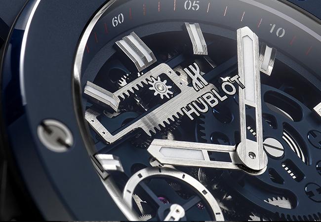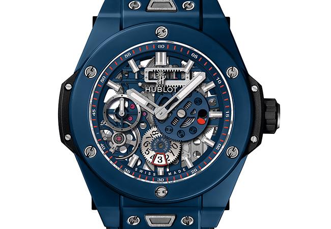 Big Bang Meca-10藍陶瓷腕錶的HUB1201宇舶手上鍊鏤空機芯,經過兩年時間研發精進後問世,具備10日動力儲能,包括223個精密零件,雙重發條盒,平行於動力儲能指示的齒輪系統,兩條沿著橫軸滑行的齒軌,精密傳輪動力的同時,視覺上更令人驚艷。雙重動力儲能顯示,包括位於3點鐘位置的齒輪盤,當動力即將耗盡之時,紅色圓點便會出現在視窗中提醒佩戴者適時上鍊;6點鐘位置的齒輪則以數字顯示動力剩餘天數。7點鐘位置的擺輪擒縱系統,伴隨著9點鐘位置的小秒指示盤,提供醒目的時間指示。