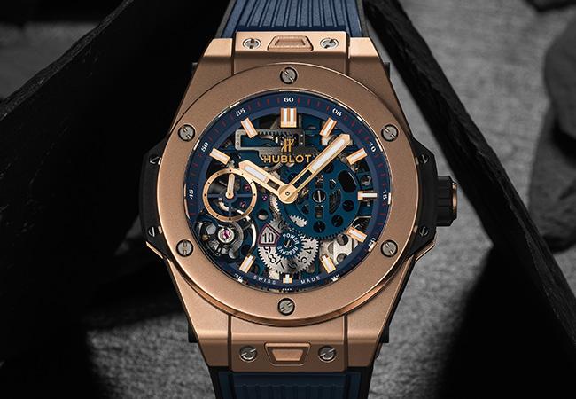 同步發表的第二款全新Big Bang Meca-10腕錶則採以宇舶專利皇金(King Gold)材質打造,將皇金紅潤的王者氣息,與藍色鏤空面盤的深邃沉穩融合為一。藍寶石水晶鏡面底蓋搭配天然橡膠錶帶,品牌專利“One-Click”單鍵快拆式錶帶裝置,瞬間輕鬆更換錶帶,展現獨特風範。