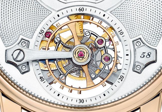 大尺寸平衡擺輪被置於旋轉框架外側也意味著它不受框架慣性重量的影響,因而提升了精準度。外置框架陀飛輪的另一個關鍵特性是其旋轉速度,每一分鐘框架完成一周旋轉,指明秒數的同時也令佩戴者欣賞到陀飛輪律動之美。