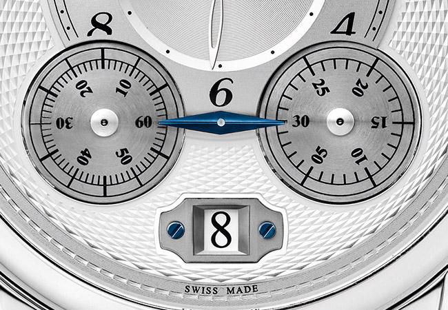 本款全新腕錶的銀白色面盤經過全面改造,特別著重於美學與鐘錶細節的比例,使本款腕錶具有更佳時間讀取清晰度以及頂級製錶美學。偏心式小時環與鈦金計時旋轉盤採微拱設計,營造出立體的效果。黑色羅馬數字仍沿用本系列的設計規範,但是字體上較為纖細,外環採軌道式分鐘刻度環。典雅的藍色葉形指針使腕錶的整體設計更臻完美。六點鐘位置配置日期顯示窗,兩旁的藍色螺絲提升了面盤的精緻度。為了呈現頂級製錶的外觀,面盤飾以優雅的扭索紋飾,小時環的中心點採蔚藍色修飾,而面盤外環則飾以陽刻浮雕扭索紋飾。此外,面盤外圍印有Nicolas Rieussec字樣,藉以向知名計時器發明人致敬。