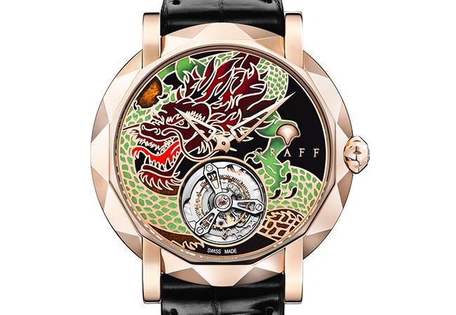 龍在亞洲文化中別具意義,在歷史和傳統裡也有舉足輕重的地位,剛好與格拉夫不謀而合。腕錶以現代手法演繹神龍的威武形態,龍爪緊握火球和陀飛輪。