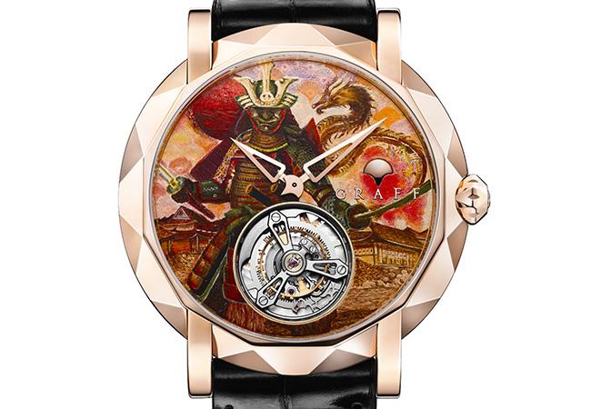 格拉夫GRAFF隆重呈獻全新男裝美術工藝腕錶系列,每一只時計也體現極致非凡的藝術美學、精湛工藝與匠心巧手。格拉夫從日本藝術和文化汲取靈感,雕琢出瑰麗奪目的奢華錶盤,成就全新的MasterGRAFF Ultra Flat陀飛輪腕錶。纖薄的錶殼結合格拉夫無出其右的寶石鑲嵌工藝、世紀傳承的微繪工藝、細緻的琺瑯工藝,以及精準可靠的飛行陀飛輪,而品牌標誌性的鑽石琢面錶圈上,更鑲滿特別切割的璀璨美鑽,令人驚艷。