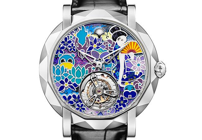 格拉夫與藝術世界緊密相連,創辦人勞倫斯‧格拉夫OBE更是知名的當代藝術收藏家。第三款錶盤從當代藝術大師村上隆取材,結合藝伎與蓮花等傳統日本文化元素,並添上繽紛時尚的設計,向日本街頭藝術致敬。錶盤採用格拉夫工匠獨家研創的罕見工藝「emaille à froid」,把琺瑯燒至相對低溫的攝氏180度,以塑造平滑光亮的效果。