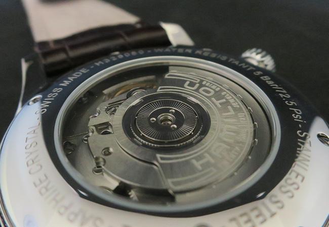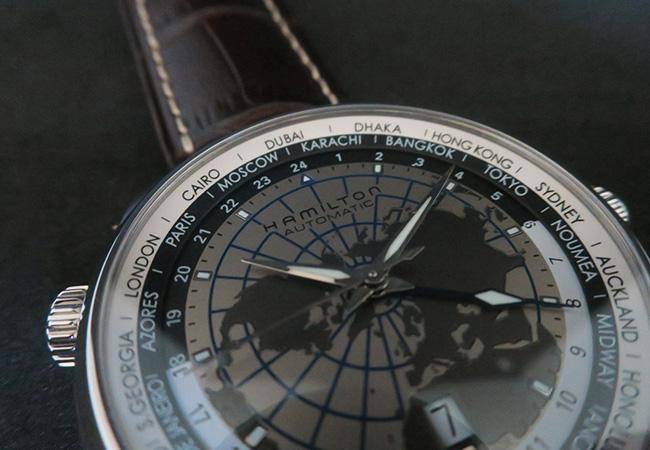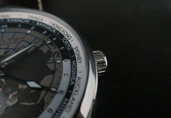 於是,可以看到漢米爾頓此款Jazzmaster GMT除了功能實用外,還增加了更明確的裝飾。最顯而易見的是面盤一改之前的樸素,增加了世界地圖裝飾,以此更加凸顯錶款的設計目的。這只錶款雖然名為GMT,但透過旋轉錶圈的設計,其實也能夠作為世界時區錶款使用。