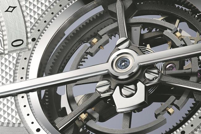內裝581 DRF自動上鍊機芯,厚度僅3mm,連錶殼的厚度也僅7mm,機芯結構的細膩當然非同小可。偏心陀飛輪跳脫一般常見於六點鐘位置的設計,並註冊多項專利。陀飛輪框架與擺輪採用鈦金屬材質,擺輪游絲使用研發多年的矽材質。擒縱結構則混用了矽與防磁鋼製作。如此配置,讓結構除了結合陀飛輪機制本由的實質功能外,更進一步避免磁力對於結構運作的可能影響,同時能夠藉由