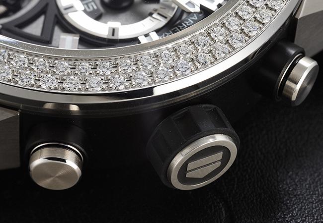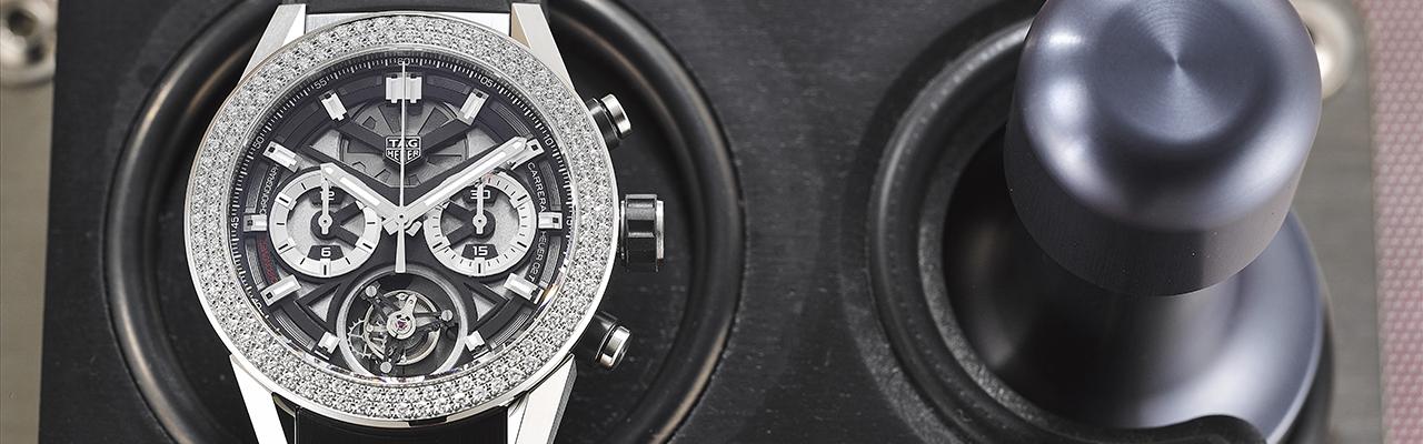TAG HEUER泰格豪雅在2016年推出全球首款50萬價位的陀飛輪計時碼錶Carrera Heuer 02T後,在2017年則陸續發表碳纖維、18K玫瑰金與鑲鑽版,而這款鑲嵌華麗雙排圓鑽的款式,價位僅在78.1萬元,同樣擁有極高的競爭力。