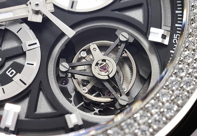 為了減少陀飛輪裝置的重量,廠方以過去的 Monaco V4陀飛輪裝置為概念;上方的框架採用碳纖維材質製造,而中層框架使用鈦金屬製造,透過極為輕盈的結構,使錶款僅為單發條盒,卻能保有65小時的動力儲存,其振頻仍屬於較高的28,800轉。