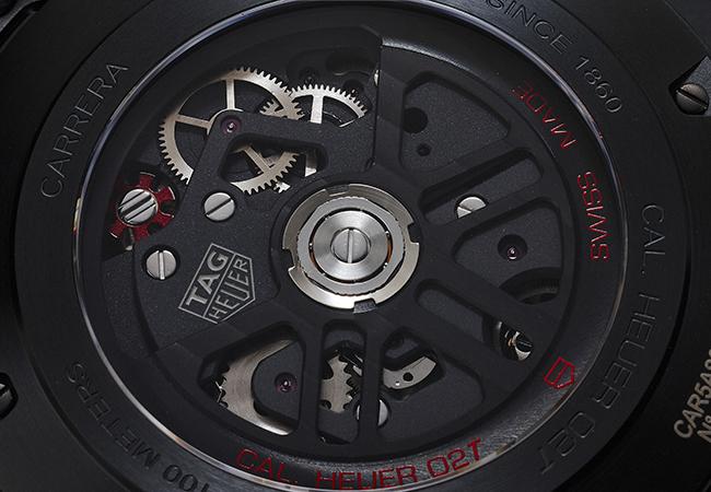 為了保有與Calibre Heuer 01機芯相同的設計風格,Calibre Heuer 02T機芯也採用表面黑化處理,同時在導柱輪上方漆上紅色,更增添運動風貌。而Heuer 02T機芯與Heuer 01機芯同樣具有導柱輪,但是Heuer 02T機芯採用垂直離合計時結構,不同於Heuer 01機芯的水平離合結構,實際操作計時功能,計時秒針的啟動與停止精確到位,不會抖動與延滯,是垂直離合結構的優勢。