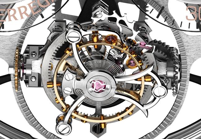 另外面盤的通透設計也很值得一提,今年的芝柏表在Laureato、Neo Tourbillon都有鏤空的面盤呈現,通透可說是芝柏表的年度關鍵字之一,不過這款三問三軸陀飛輪,面盤用得不是鏤空的技法,而是用藍寶石水晶玻璃製作獨立的小時和分鐘盤,更特別的是它們的軸心,固定在下方黑色PVD的箭頭型長形錶橋上,這個設計是向La Esmeralda懷錶致敬的靈感,經由透明的時分盤可以窺見下方的機芯結構。而三軸陀飛輪的轉軸,分別以兩分鐘、一分鐘和三十秒轉一圈,六點鐘位置為三軸陀飛輪預留的空間,可以清楚看見它立體的作動。