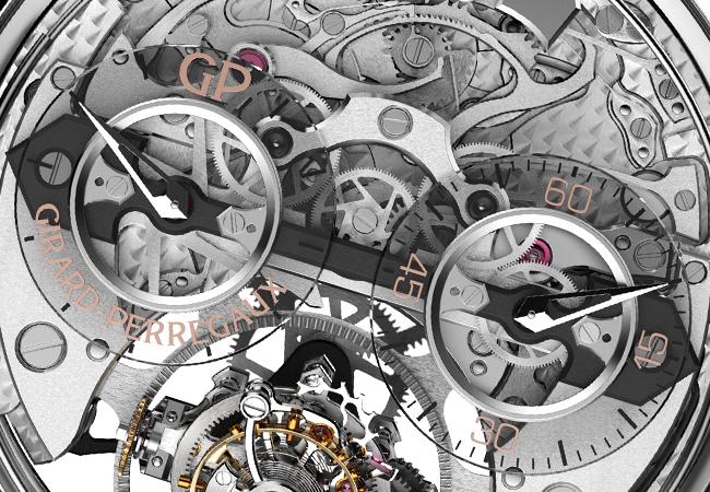 芝柏表為今年這款重點作品打造新機芯,機芯主要分為走時、陀飛輪和三問的三層結構,除了精準度的先決條件之外,增強報時的音量是主要目標,因此機芯設計上改變了三問錶機芯以往的結構,將音鎚和環狀音簧等通常置在機芯背面的零件,改放在最上層,如此一來音鎚敲擊音簧時的報時聲響,就不會因為靠近貼著手腕的底蓋而受到影響。