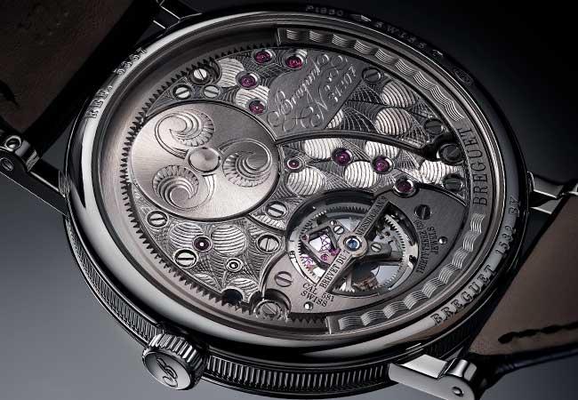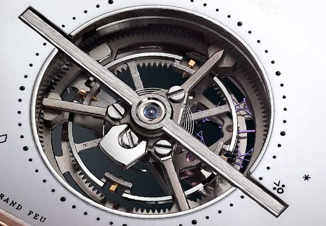 寶璣並沒有為了追求超薄而使用飛行陀飛輪,相反地,堅持寶璣原創的傳統陀飛輪樣式,並將之薄型化,固定陀飛輪的上、下橋板簡化為細長的一字形,且陀飛輪框架改為扁平式設計,並以輕量化的鈦金屬打造,陀飛輪的軸承以藍色尖晶石製作,與一般的紅寶石軸承有明顯的區別。在欣賞陀飛輪之際,也能看到藍紫色鏤空矽擒縱輪的運作,在傳承自兩百年前的陀飛輪上面,也融合了最新科技與未來。矽游絲、矽擒縱輪,以及順磁性金屬打造的擒縱叉都具有不受磁場影響的特性,強化了這款腕錶的防磁效果。