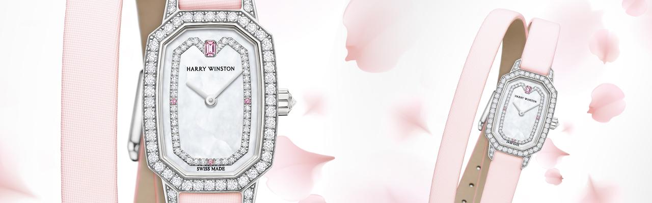 誕生於2016年的Emerald 系列,是HARRY WINSTON海瑞溫斯頓為了向創辦人致敬,以他鍾愛的鑽石切工為發想的設計。當時剛推出時以HARRY WINSTON的藍紫色為主調,2018年則是加入更為粉嫩的新款,以粉紅剛玉和粉紅色的雙圈緞質錶帶,組合成更柔美的視覺呈現。十二點鐘位置的祖母綠型切工粉紅剛玉,搭配從中間往兩側下凹的圓鑽,看起來就像是個愛心的圖案,浪漫的細節更加濃厚。