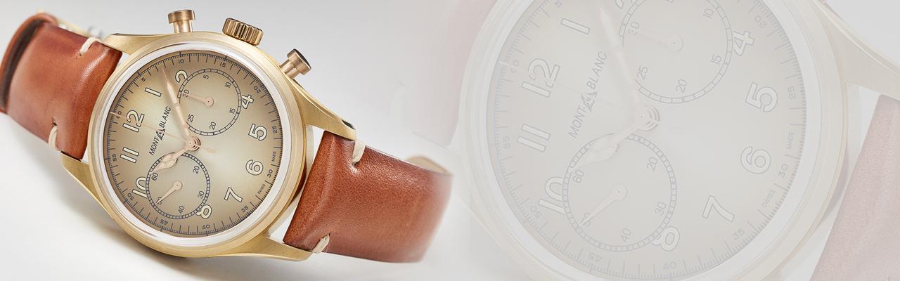 2018年新款的1858青銅材質計時碼錶,是香檳色的漸層面盤,搭配雙眼計時盤以及教堂式指針、還有圓柱形的計時按把,充滿濃厚的古典味,兩個計時盤的位置也是復刻Minerva經典計時碼錶的設計。至於錶背的部分,像沛納海和IWC都直接用鈦金屬,取代可能會有致敏性的青銅材質,但在這裡萬寶龍是在鈦金屬上鍍了青銅色,讓整體色澤看起來一致,底蓋上也鐫刻了白朗峰、指南針、以及兩把交叉的冰斧,符合了萬寶龍2018年的山岳探險主題。