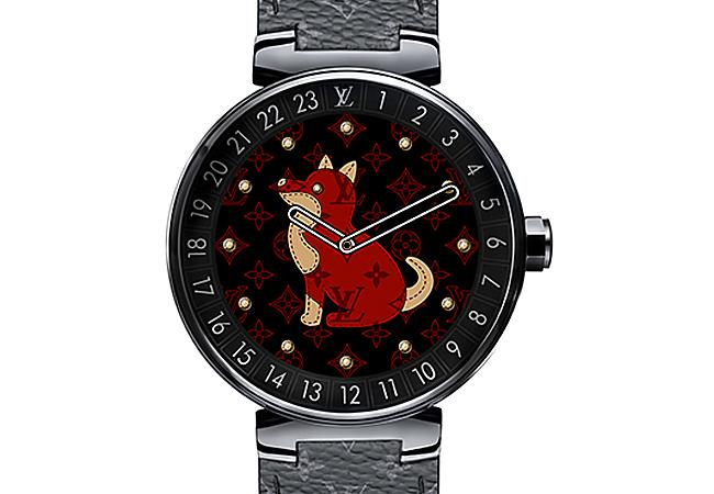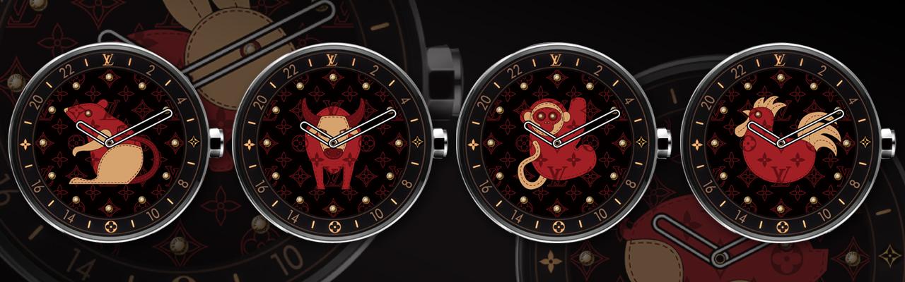 2017年LV推出的Tambour Horizon智能錶,在2018年的中國新年前夕推出更新版本,面盤新增了十二生肖的圖案可以選擇。一開始Tambour Horizon就已內建九種面盤的基本款式,透過My Favourites以及My Stripes,可以隨意選擇搭配出不同背景(Monogram、Eclipse、Damier、Damier Azur等等)而且各有十二種顏色的條紋顏色搭配,面盤螢幕也可以打上initial的名稱縮寫,大約可以組成五千種的面盤變化,錶帶款式也有大約60種可以購買,儼然是客製化的模式操作。