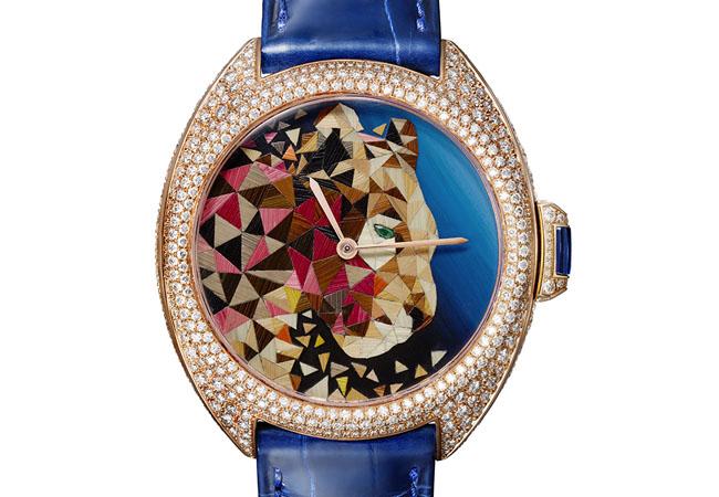 Clé de Cartier今年新的工藝錶款,以秸稈這類農作物的莖葉部分為創作素材,拼貼成美洲豹的側臉輪廓,眼睛還鑲嵌了一顆祖母綠做點綴,顏色搭配運用得很好。44.31x43.13mm/18K玫瑰金/限量30只
