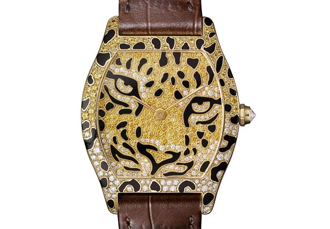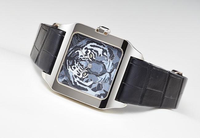卡地亞今年的琺瑯面盤出現在Santos-Dumont上,以琺瑯工藝描繪出老虎的霸氣神情。36.6x47.4mm/18K白金/限量30只