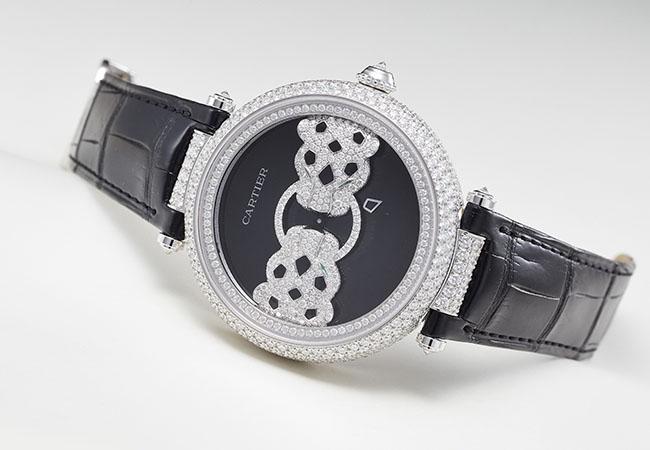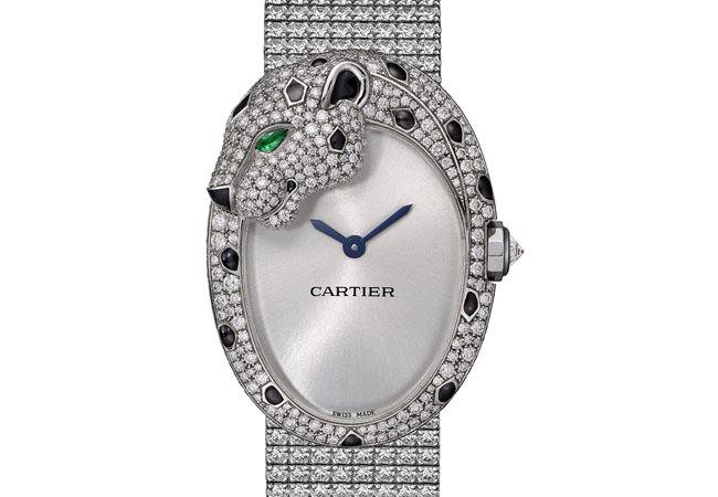Baignoire系列今年除了有四款Cartier Libre新作的延伸之外,這款美洲豹腕錶也以它的橢圓外殼為發想,將美洲豹設計在錶殼的盤踞,鍊帶也華麗鑲滿了鑽石。39x31.5mm/18K白金