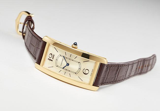 2017年Tank一百週年推出的Tank Cintrée,今年推出更為古典的復刻面貌,黃金錶殼搭配香檳色面盤,6和12兩個大型阿拉伯數字時標,搭配中央軌道式刻度十分典雅。46.3x23mm/黃金