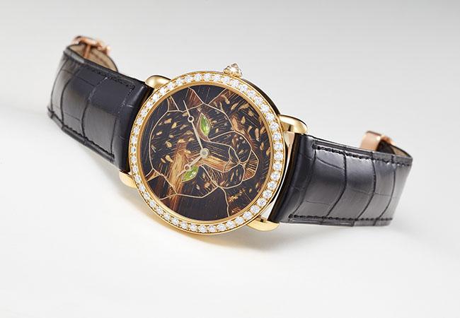 將黑檀木層疊於24K金的金箔上,中間再穿插棕色的桃花心木,工匠需費時五天的時間才能完成豹頭圖案的工藝製作。36mm/黃金/限量30只
