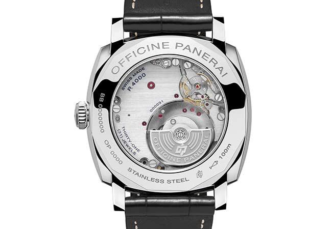全新P.4000 機芯是沛納海首款配備偏心式擺陀的自動上鍊機芯。這意味著,擺陀的直徑小於機芯本身:這項精密的卓越技術令機芯以及腕錶整體都變得更纖薄。在採用精鋼材質錶殼的錶款中,擺陀是以鎢製成,這種閃亮的高密度金屬具有優異特性,它在外觀上極具美感,而且非常適合用於需要高比重材質的地方。在紅金材質錶款中的擺陀則以22ct.紅金製作,透過錶底蓋上的透明藍寶石水晶玻璃即可欣賞其精緻工藝與典雅的視覺美感。