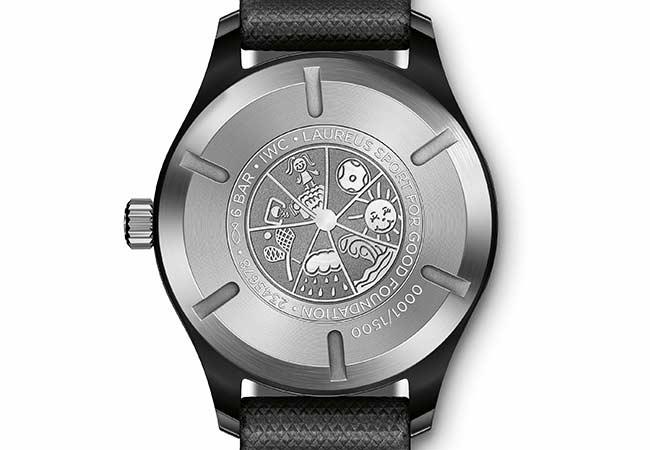 如同每一款勞倫斯體育公益基金會特別版腕錶,此款腕錶的特色即為鐫刻在繪畫比賽中獲得優勝的作品,而這項比賽是IWC萬國錶每年在基金會支持的專案中所舉辦的,2017年的主題是「健康時刻」(Time to Be Healthy),評審們在一千件參賽作品中選出11歲Ana Claudia的作品。Ana參加了巴西教育組織「回應機構」的專案,此機構透過教育與運動幫助改善巴西兒童及青少年的生活條件,特別是以柔道的訓練來傳遞尊重、紀律與決心的價值觀。錶款銷售收益的一部分將用於支持勞倫斯體育公益基金會。