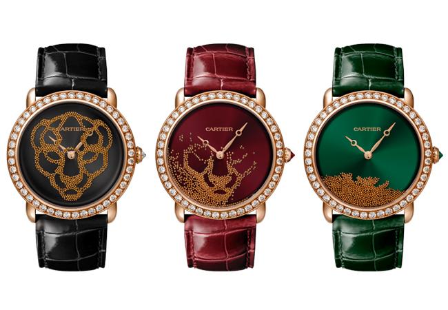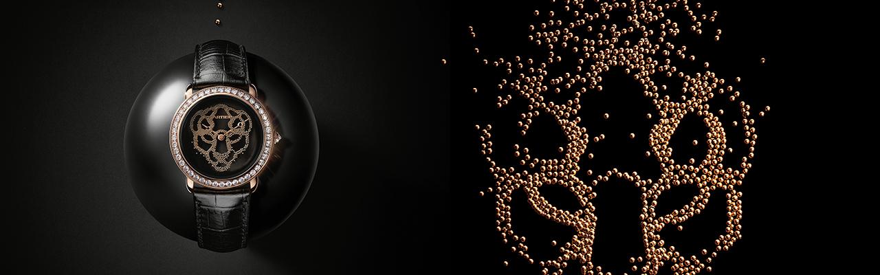 複雜功能、高級珠寶腕錶、以及特殊工藝技法,是卡地亞每年錶展的三大主軸,2018年品牌仍持續在技法上演進,繼之前的金銀絲細工、金屬珠粒工藝、和去年的火金工藝之後,以沙漏為發想、用金屬珠粒為介質的Révélation d'une Panthère美洲豹腕錶,是今年的新呈現。